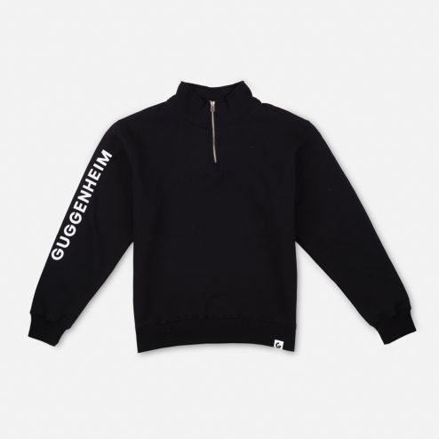 Sudadera con media clemallera realizada en algodón, con logo Guggenheim en una manga y las cuatro ciudades que son sede de los Museos de la Constelación Guggenheim en la espalda.